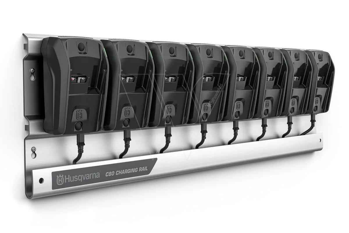 Het Husqvarna C80 laadstation biedt een handige manier om tot acht Husqvarna BLi 36-volt accu’s bijvoorbeeld in de nachts op te laden. Het laadstation kan aan de muur van de werkplaats worden gemonteerd om ruimte te besparen en houdt je C80 laders veilig op hun plaats en vrij van verwarde kabels. De 8-op-1 kabelverbinding heeft alleen een stopcontact nodig voor stroom. Is stil dankzij opladen met laag vermogen en maakt een koelventilator overbodig. Het laadstation bevat een aluminium rail, snoer en acht C80 laders.